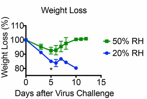 The study found that mice housed at 20%RH suffered a worse disease course compared to those kept at 50%RH, with more rapid and greater weight loss, drop in body temperature and shortened survival. In fact, whereas all mice at the lower humidity died within 11 days of infection, of those that experienced 50%RH, just under half survived until the end of the experiment.
